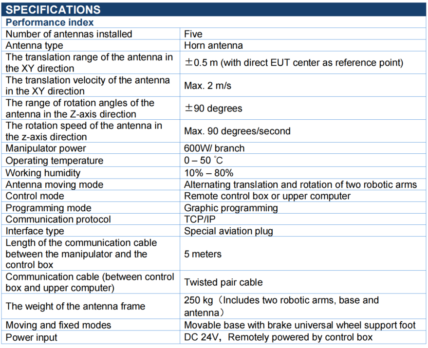 The ATM1001 antenna stand system is designed for multi-antenna positioning and polarization adjustment, enabling automatic switching of different transmitting antennas during electromagnetic compatibility immunity testing. The system consists of 6 degrees of freedom robotic arm coordination work, through fiber programming, remote programmable software to achieve automatic control of different test requirements, select the antenna and antenna position, pitch Angle and plan arbitrary customization.